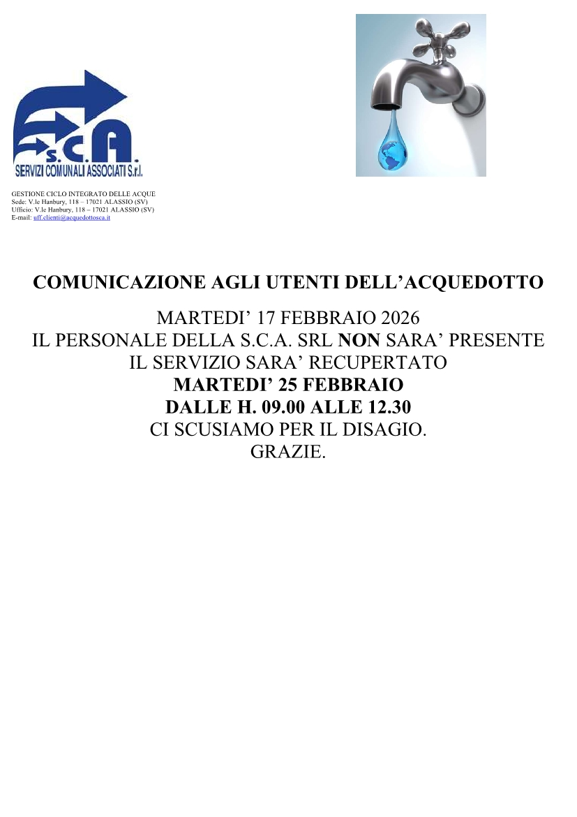 Avviso chiusura dello sportello clienti SCA per il giorno martedì 17 febbraio 2026.