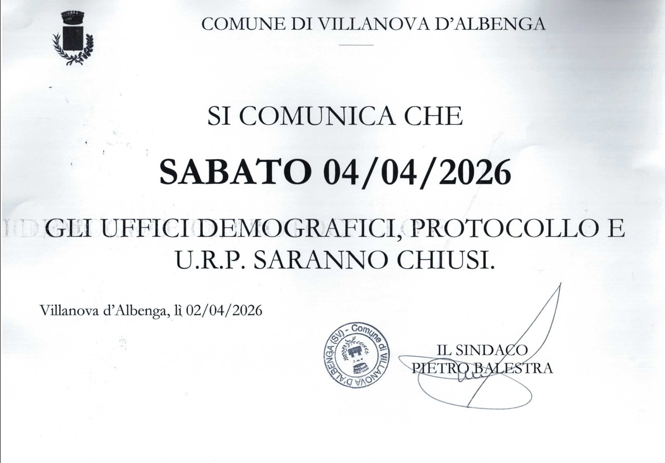 Si comunica che Sabato 4 Aprile 2026 gli uffici demografici - protocollo - URP saranno chiusi