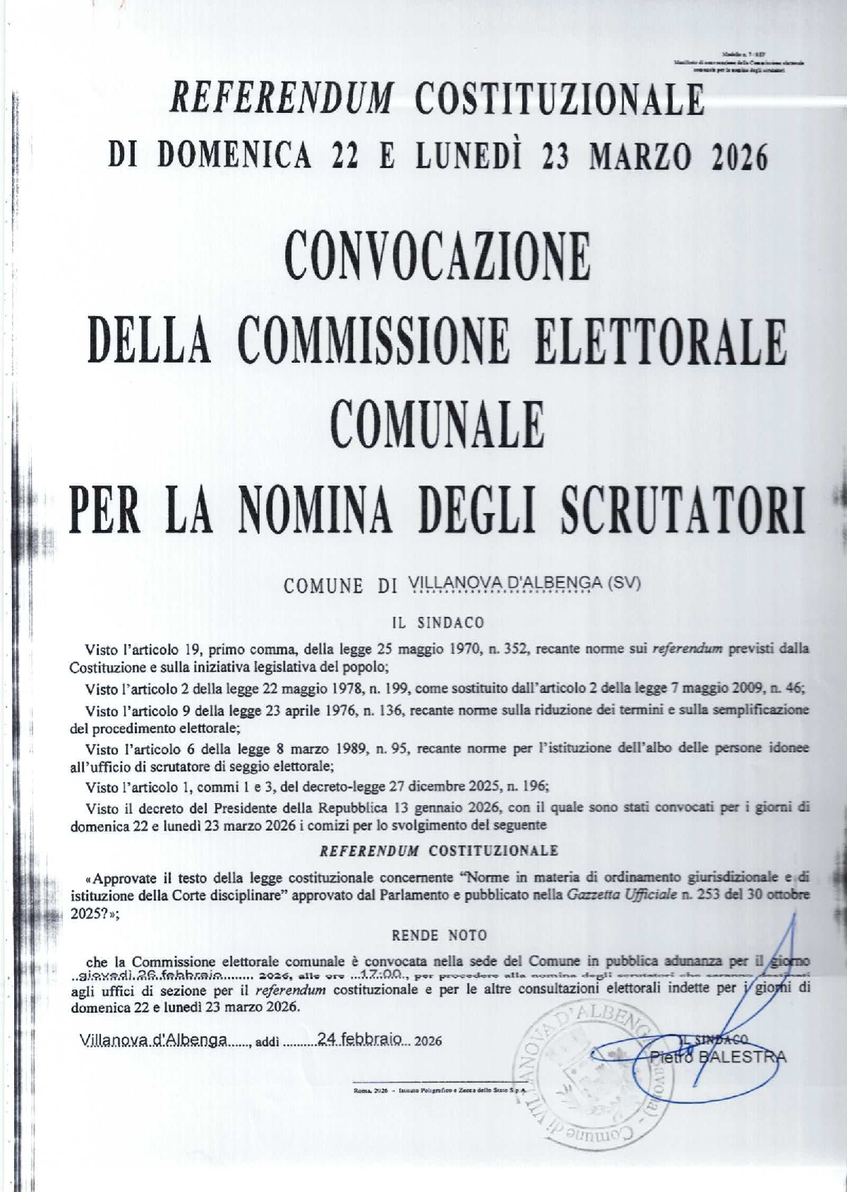 Referendum Costituzionale di domenica 22 e lunedì 23 marzo 2026 - Convocazione della Commissione Elettorale Comunale per la nomina degli scrutatori